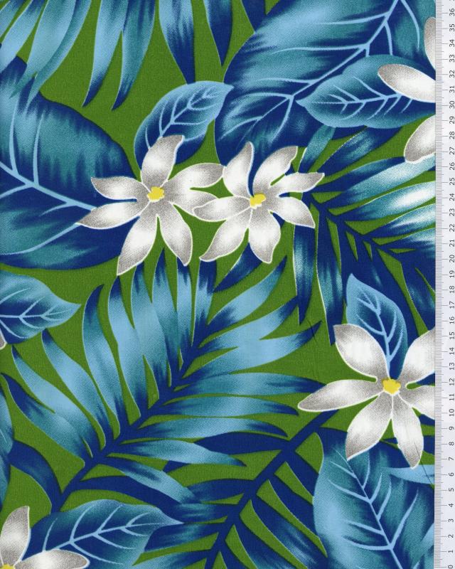 Printed polyester / cotton fabric with Polynesian patterns representing foliage. This fabric is ideal for your sarongs, clothing but also for decoration.