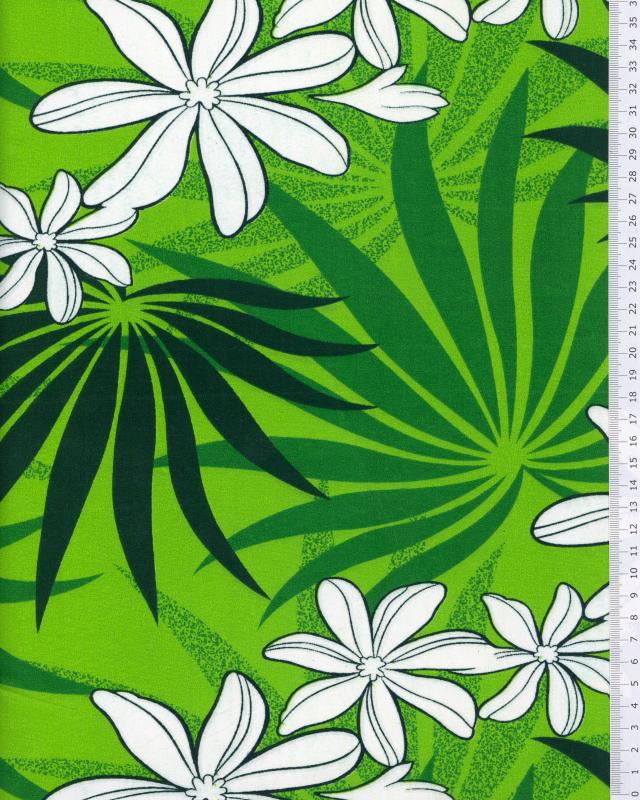 Tissu polyester / coton imprimé avec des motifs Polynésiens représentant de grandes feuilles. Ce tissu est idéal pour vos paréos, pour l'habillement mais également pour la décoration.